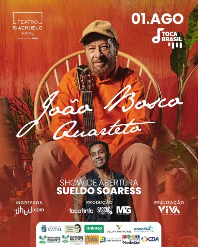 Dois grandes nomes da música brasileira dividem o palco do Teatro Riachuelo Natal no dia 1º de agosto pelo Projeto Toca Brasil. João Bosco, um dos maiores compositores do país, é a atração principal da noite que terá abertura do potiguar Sueldo Soaress. O evento é realizado pela Viva Promoções e marca uma celebração à […]