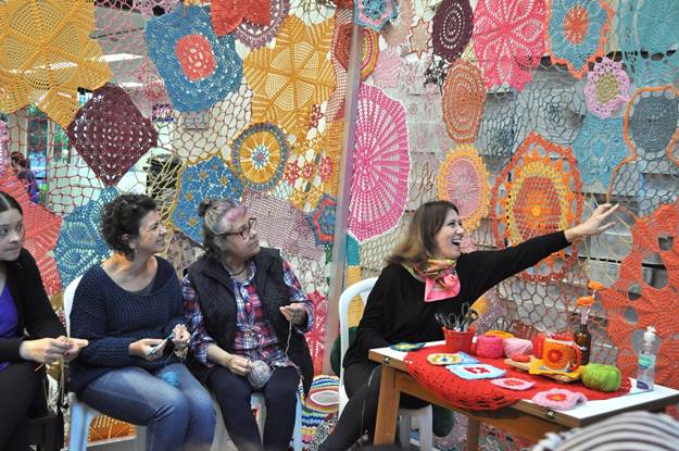 Todo o crochê que reveste a casa, cuja área é de cerca de 12m2 e 2,5m de altura, foi confeccionado manualmente pelo coletivo de mulheres Lucianas & Marias, de Curitiba.