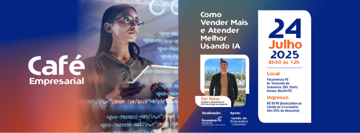 A inteligência artificial vem transformando a forma como as empresas se comunicam, operam e crescem. Pensando nisso, a Federação do Comércio de Bens, Serviços e Turismo do Estado de Pernambuco (Fecomércio-PE), por meio do Instituto Fecomércio-PE, realiza no dia 24 de julho mais uma edição do Café Empresarial, trazendo como tema central “Como Vender Mais e Atender Melhor Usando IA”. O evento será realizado na sede da Fecomércio PE, no bairro de Santo Amaro, no Recife, e é voltado a empresários, gestores e profissionais que desejam aplicar soluções práticas de IA no dia a dia dos seus negócios. A iniciativa também conta com o apoio do Cartão do Empresário, o clube de vantagens da Federação.