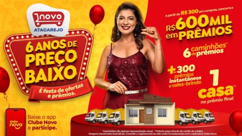 O Novo Atacarejo – que está presente em dois estados e conta com 35 lojas – está completando seis anos de atuação no mercado. Para marcar a data, a rede nordestina lança sua campanha de aniversário, que vai entregar R$600 mil em prêmios aos clientes. Essa premiação inclui uma casa, seis caminhões com brindes e mais 300 prêmios instantâneos.