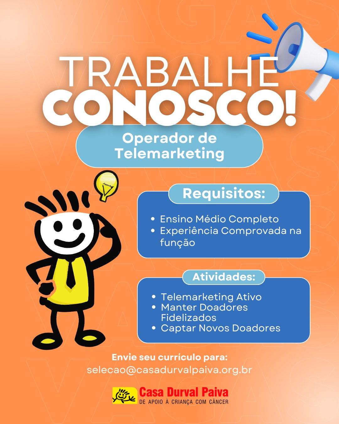 Para se candidatar, é necessário ter ensino médio concluído e experiência comprovada na função. Também é necessário ser flexível a metas e desafios, poder de negociação, proatividade e boa comunicação. Oferecemos salário e comissão. As atividades desenvolvidas serão telemarketing ativo, manter doadores fidelizados e captação de novos doadores.