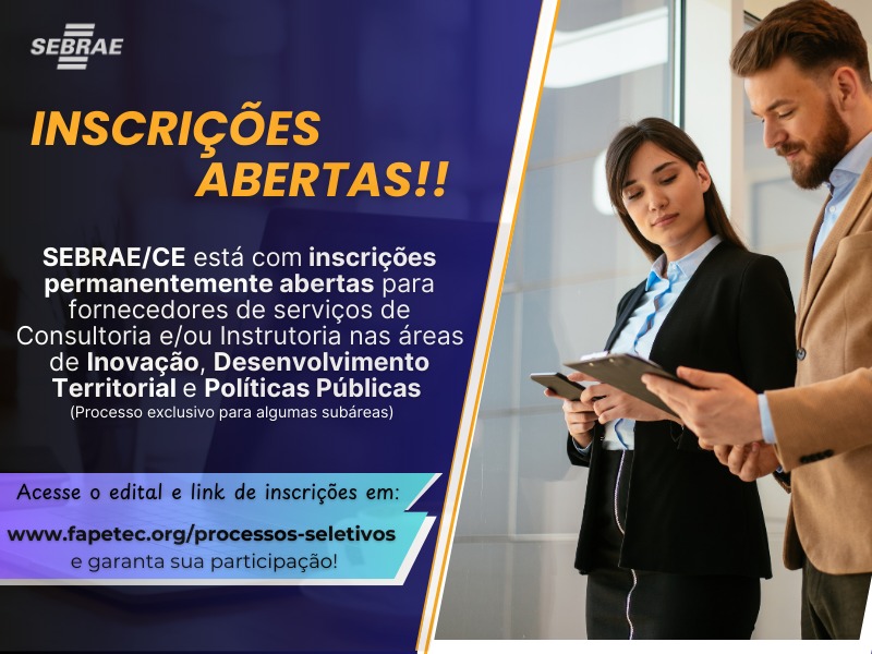 O Sebrae-CE, assessorado pela Fapetec (Fundação de Apoio a Pesquisa, Ensino, Tecnologia e Cultura), anuncia que estão abertas as inscrições para credenciamento de fornecedores de serviços de Consultoria e Instrutoria, por meio do Sistema de Gestão de Fornecedores (SGF), com prioridade para as áreas listadas acima.