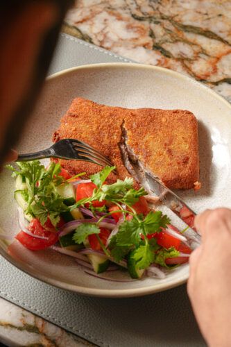 Nos pratos principais, o cachopo, carne empanada recheada com bacon e queijo, chega acompanhado de salada fresca de tomate, cebola, pepino e coentro; talharim al ajillo, combinado a gambas salteadas e farofa crocante de ajillo; e pescada defumada, com peixe amarelo, purê defumado, finalizada com azeite de páprica e crocante de salame.