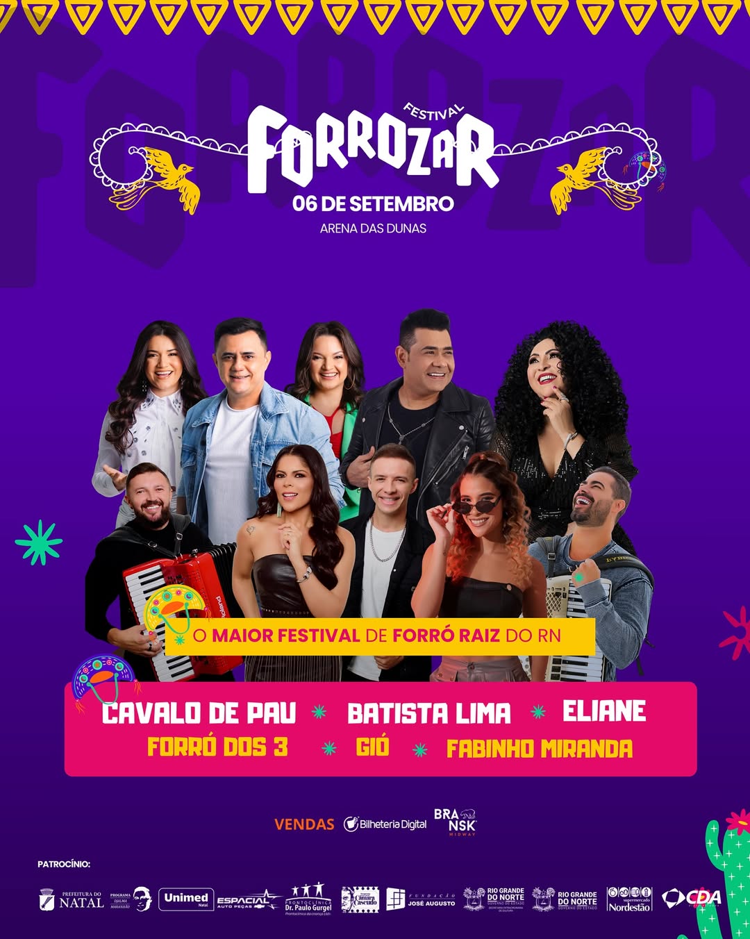 O Festival Forrozar 2025, maior celebração do forró raiz do Rio Grande do Norte, chega à Arena das Dunas neste sábado, dia 06 de setembro, para uma edição que promete marcar a história da cultura nordestina. O evento é viabilizado com o patrocínio da Prefeitura do Natal, por meio da Lei Djalma Maranhão, com incentivo da Unimed Natal, Espacial Veículos e Prontoclínica Paulo Gurgel, e do Governo do Estado do RN, através da Lei Câmara Cascudo, com incentivo do Nordestão e CDA Distribuidora.