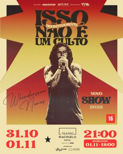 Após o sucesso de “Isso Não é um Culto”, que percorreu o Brasil em 2023, Whindersson Nunes está de volta aos palcos com um novo espetáculo que promete ainda mais humor, reflexão e irreverência. O comediante apresenta em Natal o especial inédito “Isso Definitivamente Não é um Culto”, nos dias 31 de outubro (sexta-feira), às […]