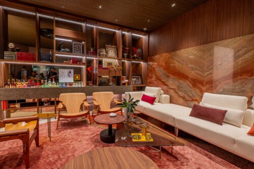 Elementos de design assinado enriquecem o espaço, reforçando o compromisso com a excelência e a curadoria de peças que dialogam com o que há de mais sofisticado no mobiliário nacional e internacional. Tudo isso é arrematado por uma adega elegante e funcional, pensada especialmente para encontros intimistas, degustações e conversas inspiradoras durante os dias de mostra.