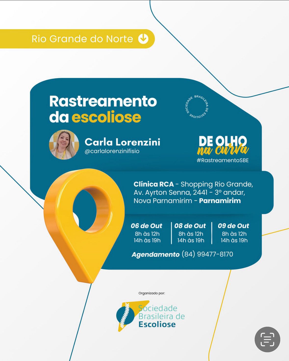 De 06 a 11 de outubro acontece o Rastreamento Nacional da Escoliose! Membros da Sociedade Brasileira de Escoliose estarão em diversas cidades do Brasil realizando gratuitamente o rastreamento. Em Natal, a fisioterapeuta Carla Lorenzini, da Clínica RCA, realizará os atendimentos.