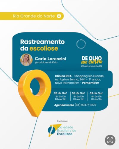 De 06 a 11 de outubro acontece o Rastreamento Nacional da Escoliose! Membros da Sociedade Brasileira de Escoliose estarão em diversas cidades do Brasil realizando gratuitamente o rastreamento. Em Natal, a fisioterapeuta Carla Lorenzini, da Clínica RCA, realizará os atendimentos. A faixa etária escolhida para participação é de 10 a 16 anos e para que […]