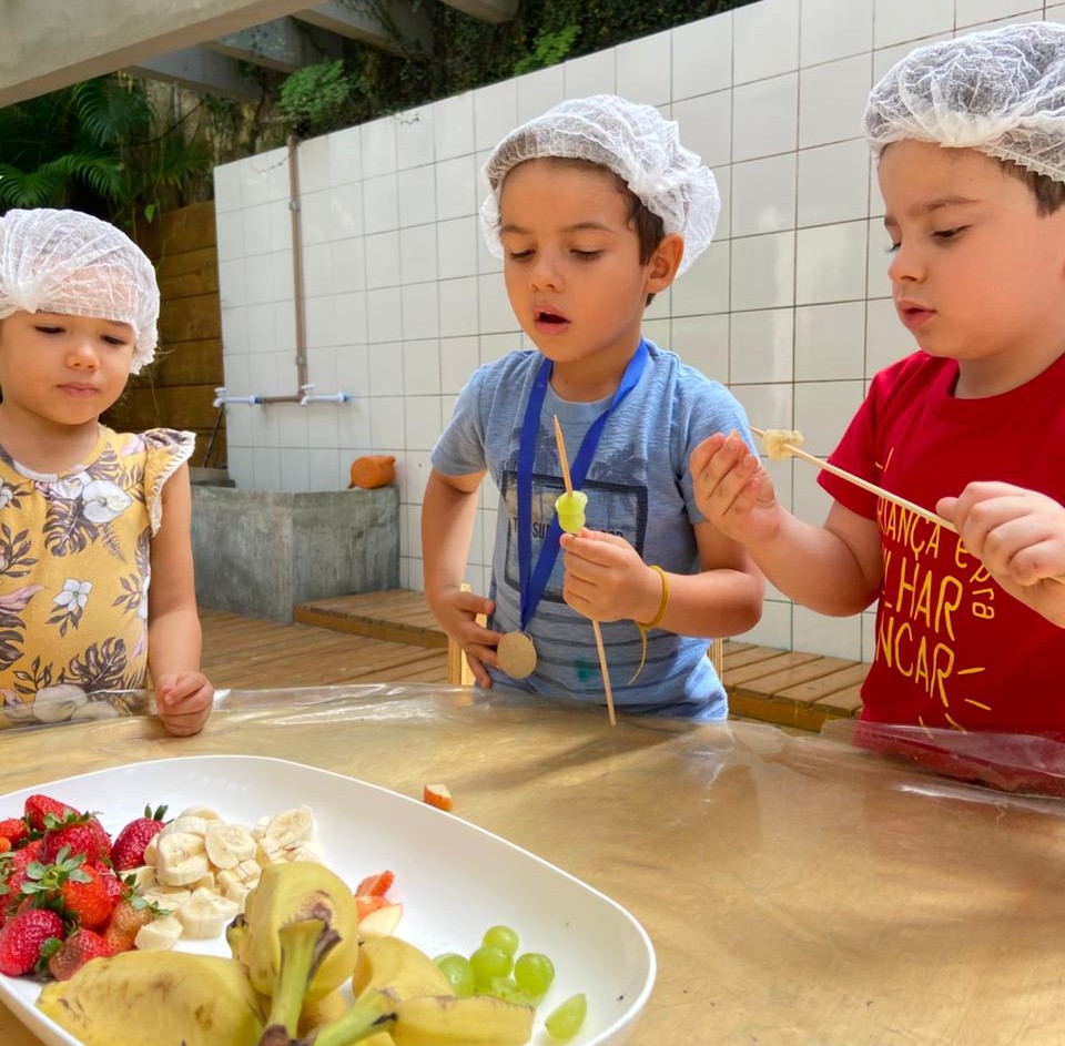 As refeições preparadas coletivamente estimulam a curiosidade alimentar, reduzem a seletividade e aproximam as crianças dos alimentos de forma leve e prazerosa. Na Oficina Sabores e Texturas, as vivências sensoriais exploram cores, cheiros, texturas e temperaturas, estimulando o paladar e a percepção.