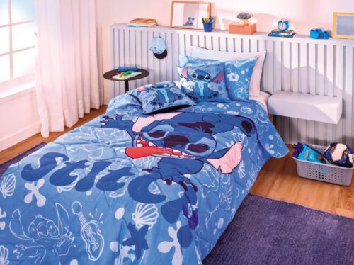 A hora de dormir vai ficar muito mais aconchegante com os novos produtos para cama! Com uma estampa exclusiva, o Edredom Solteiro Stitch (80% algodão e 20% poliéster) possui gramatura de 100 g/m², estampa dos dois lados, permitindo mudar a decoração num piscar de olhos. Já o Jogo de Cama Solteiro (80% algodão e 20% poliéster) do personagem é composto por 2 peças: uma fronha e um sobrelençol, tem estampa exclusiva e possui gramatura de 110 g/m², proporcionando conforto e qualidade para uma boa noite de sono. Para completar a decoração do quarto, a Capa de Almofada (40cm x 40cm) é ideal para dar o toque final e deixar o ambiente ainda mais divertido.