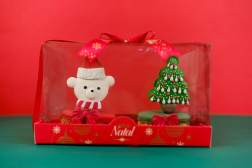 Como opções de presentes, as chefs criaram uma caixa com big macarons com personagens, podendo ser montada com um (R$ 49) ou dois (R$ 89) doces. Outra sugestão é a caixa em formato de árvore, preenchida com nove macarons personalizados, mais uma árvore de Natal feita também com o mesmo doce. Já o cartão de Natal (R$ 25) é uma linda opção de mimo. Em uma caixa com um personagem natalino em macaron, a montagem ainda tem um espaço para escrever uma mensagem.