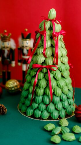 Também para enfeitar e adoçar a mesa natalina, a Torre de Madeleines surge como uma grata surpresa. O pequeno biscoito em formato de concha coberto com chocolate branco forma uma delicada árvore de Natal, disponível em três tamanhos. Já a guirlanda, também feita com a mesma técnica dos macarons, pode ser recheada da forma que o cliente desejar e vem montada com 50 mini macarons em formato de bolas de Natal (R$ 240).