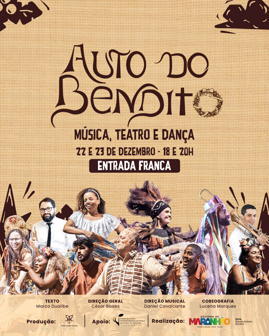 Nos dias 22 e 23 de dezembro, o espetáculo “O Auto do Bendito” retorna ao Teatro Arthur Azevedo, em São Luís (MA), com duas sessões diárias às 18h e 20h, trazendo uma narrativa natalina ambientada na Praia Grande e marcada pela força da cultura, da fé e da identidade maranhense.
