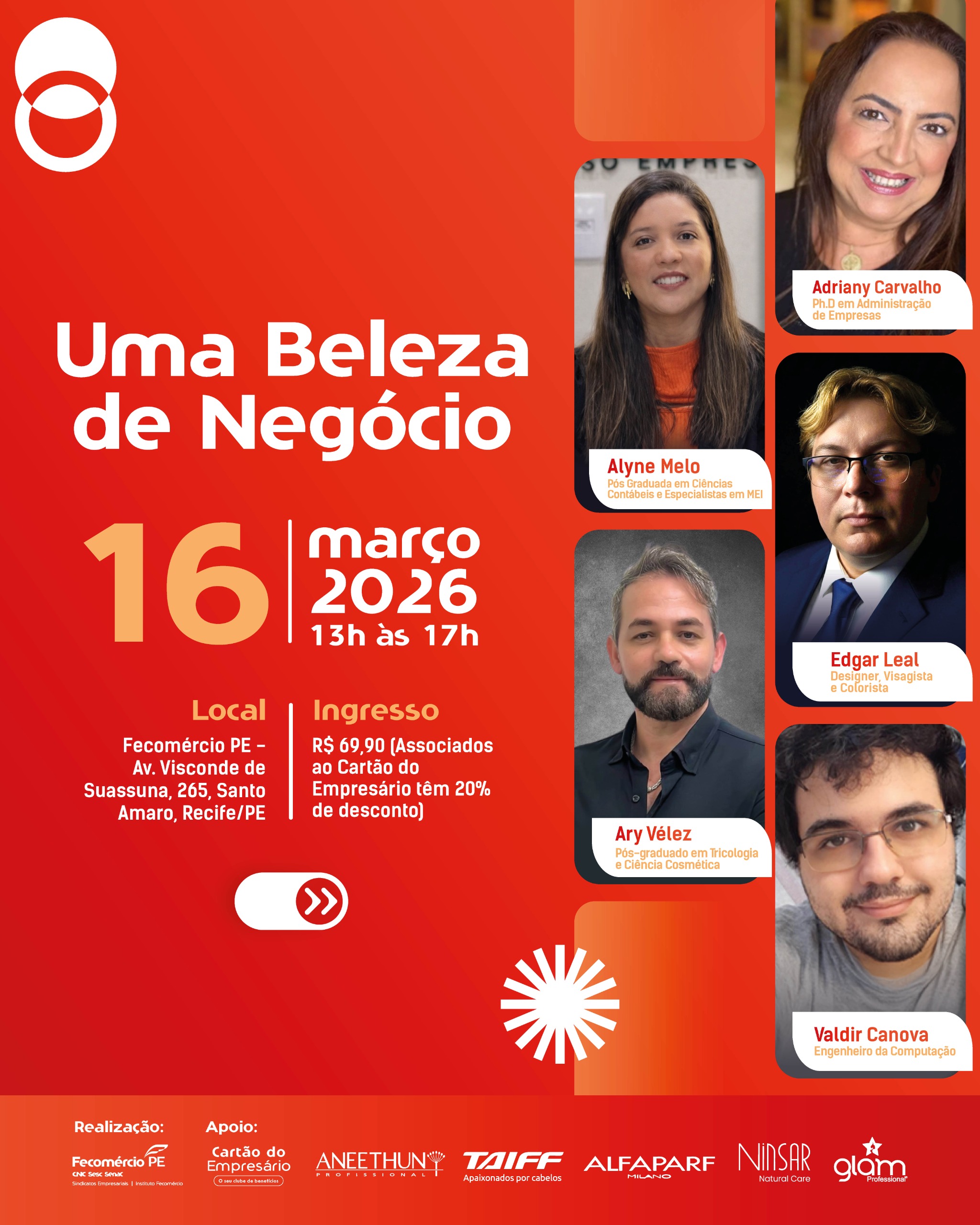 A Federação do Comércio de Bens, Serviços e Turismo do Estado de Pernambuco (Fecomércio-PE), por meio do Instituto Fecomércio-PE, promove, no dia 16 de março de 2026, o evento “Uma Beleza de Negócio”, iniciativa voltada a empresários, gestores e profissionais do setor de beleza interessados em aprimorar conhecimentos em gestão, inovação e posicionamento estratégico. A programação será realizada das 13h às 17h, na sede da instituição, no bairro de Santo Amaro, no Recife. As vagas são limitadas e os ingressos já estão disponíveis.