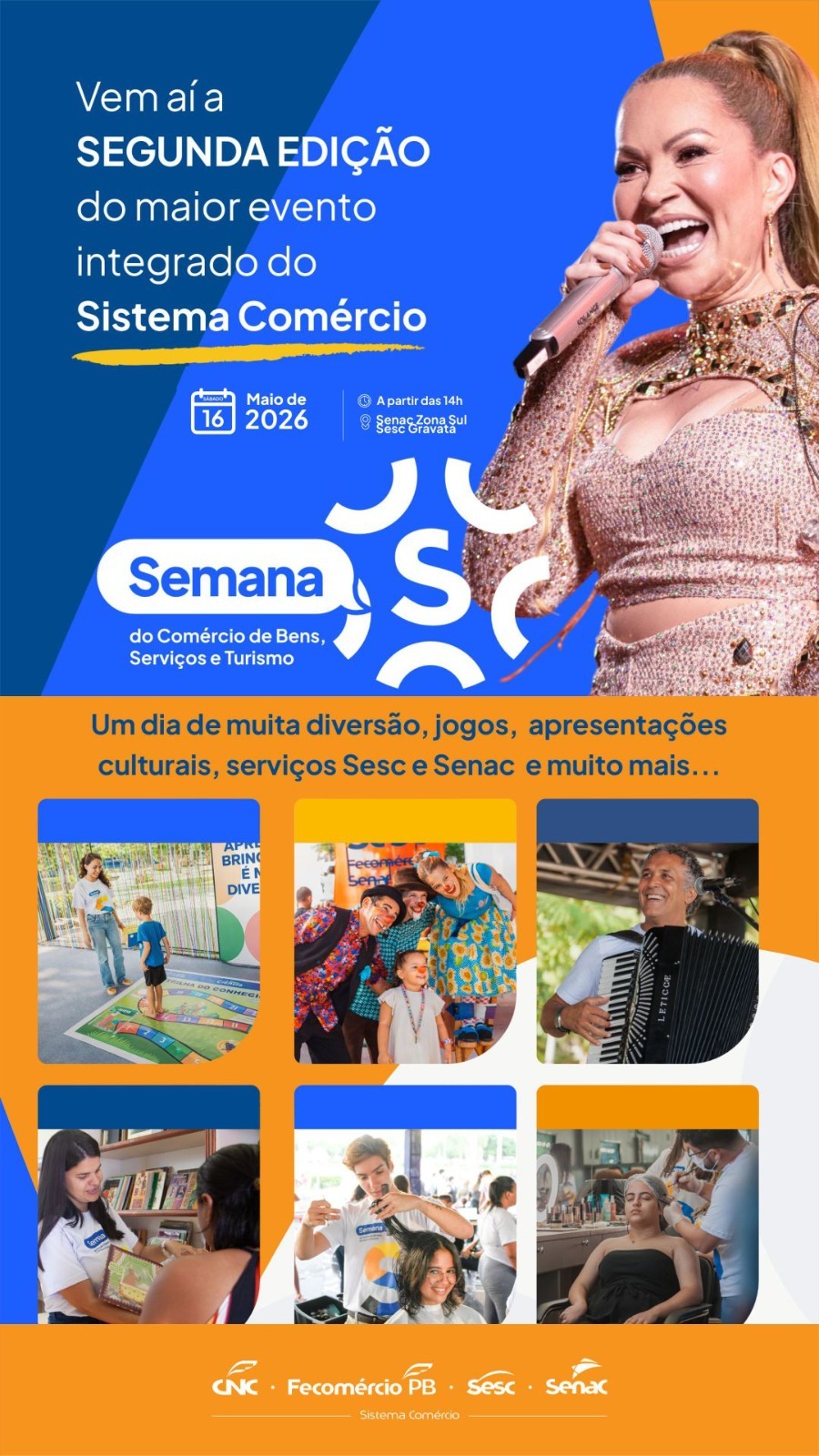 A Paraíba já entra no clima da Semana S do Comércio 2026, o maior evento integrado do Sistema Comércio no Brasil, que promete movimentar diversas cidades do estado com uma ampla programação gratuita voltada para toda a população. Promovida pelo Sistema Fecomércio/Sesc/Senac, a iniciativa acontecerá no dia 16 de maio, com atividades distribuídas em João Pessoa, Campina Grande, Areia, Guarabira, Picuí, Patos, Sousa e Cajazeiras, reunindo ações nas áreas de educação, saúde, cultura, lazer, tecnologia e qualificação profissional.
